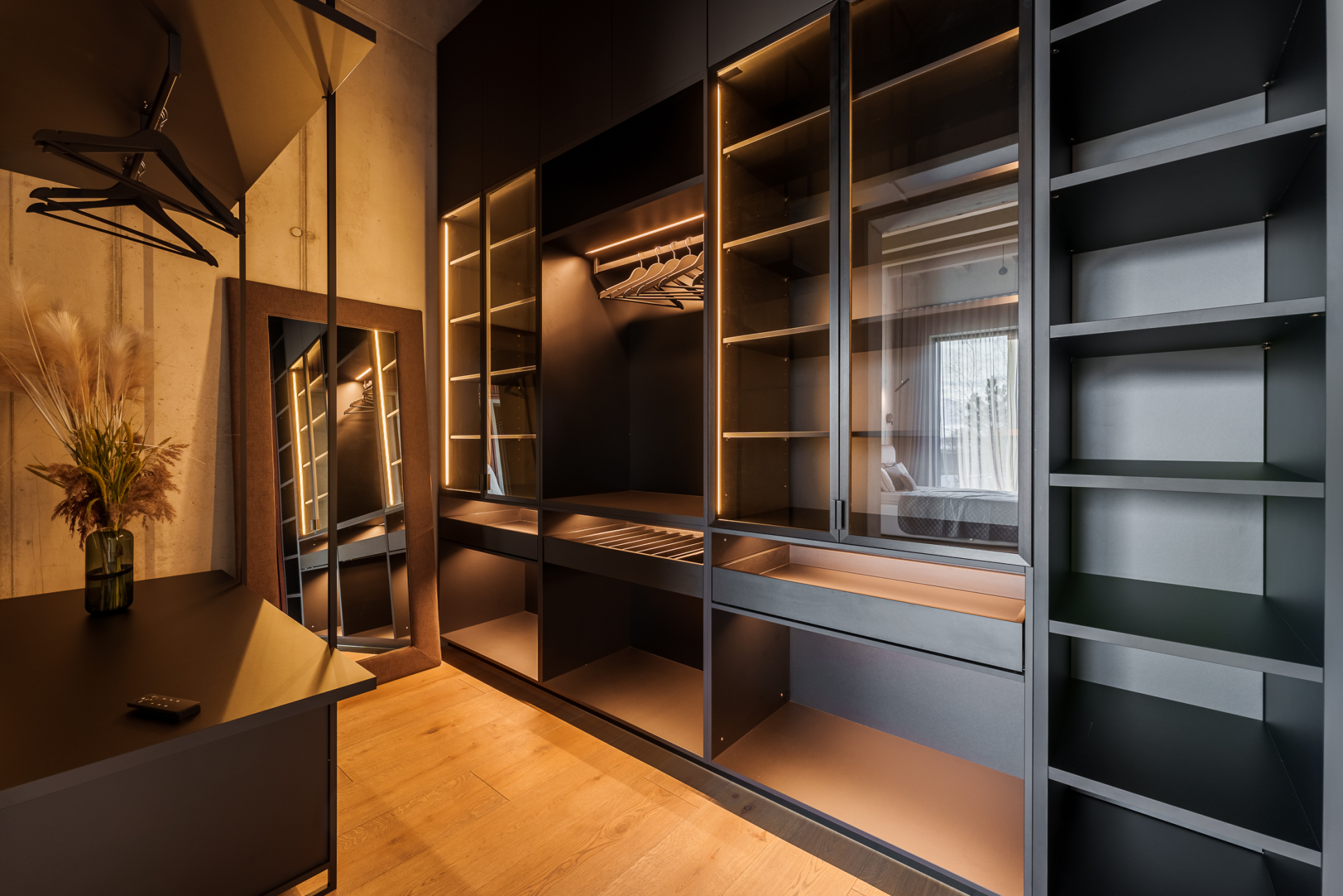 Comprehensive design of open and integrated wardrobe system with Fios-shelf units, open base units with drawers, trouser pull-out and built-in Vero light cupboards.